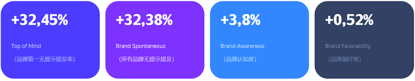 - Top of Mind —— 显示在提及某类产品或服务时,首先回忆起您品牌的用户比例增加了多少。