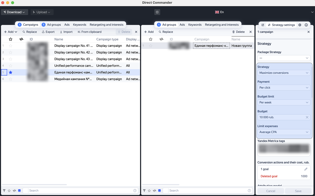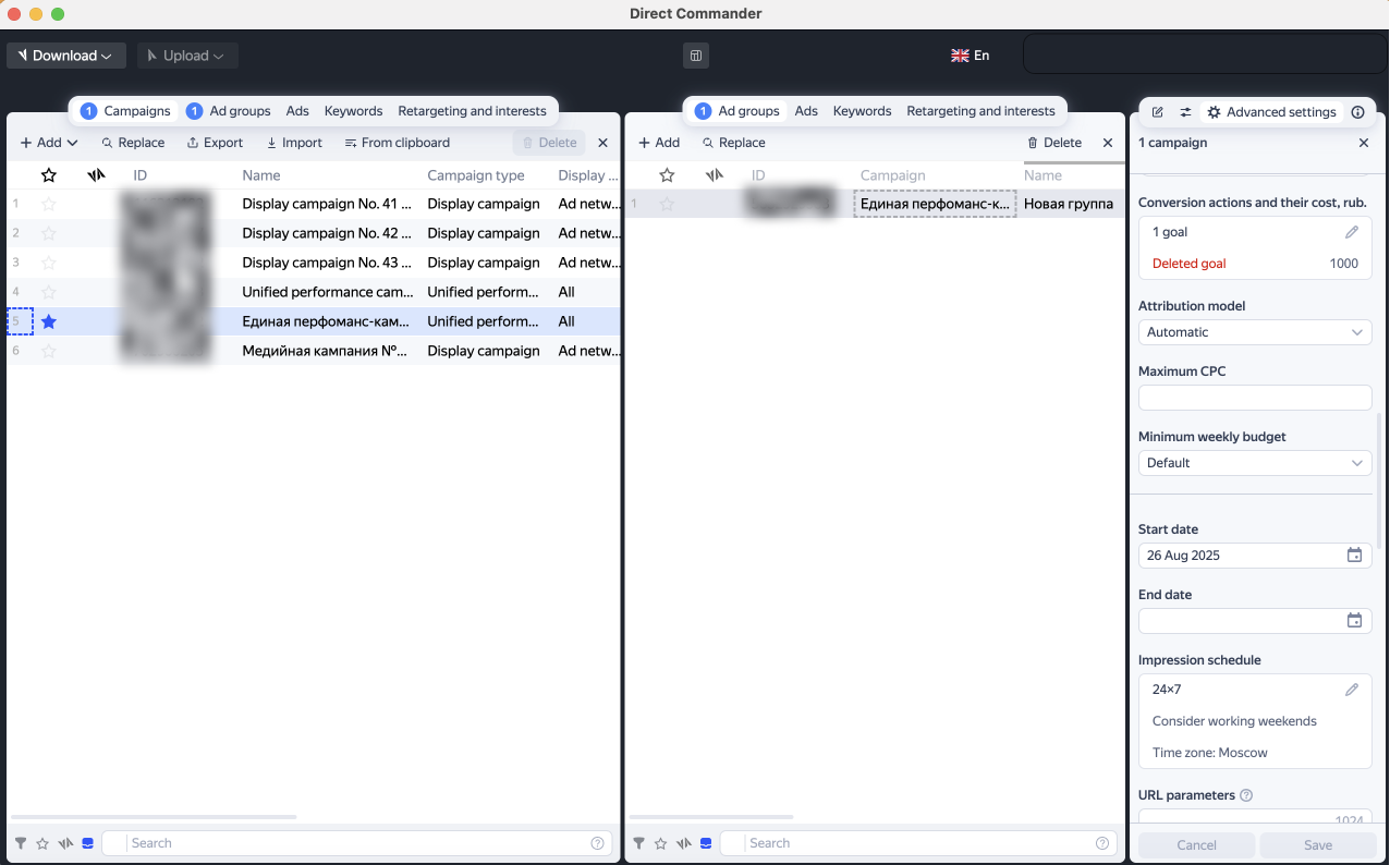 为提升易用性与功能性,我们实施了多项改进:现支持通过管理型账户登录,同步优化了界面设计,并根据 Yandex Direct 网页端的更新调整了广告系列配置选项。