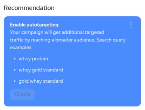 用户行为发生变化,其搜索查询也随之改变。这些变化的跟踪过程既困难又耗时。不管搜索查询如何,自动定向有助于将您的广告展示给感兴趣的人。在建议中您将可以找到被挑选的搜索查询实例和可以激活该工具的活动列表。