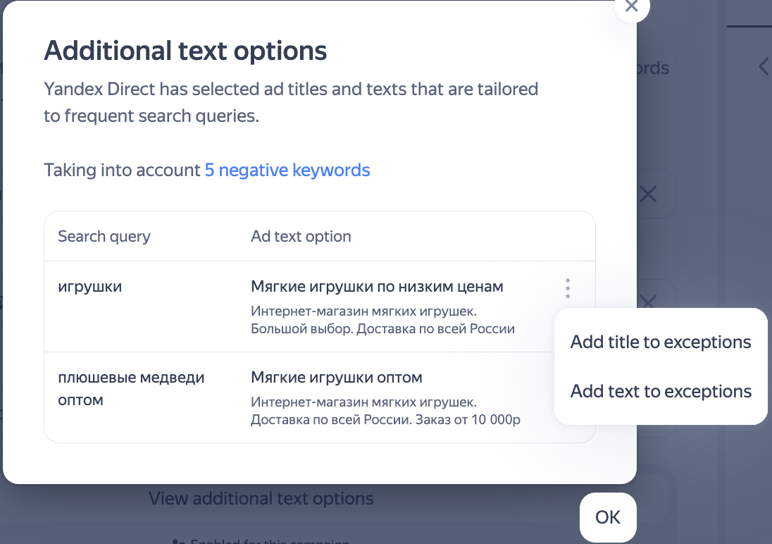 “Optimization of ad texts for search queries”选项(“根据查询优化广告文案”)基于 Yandex 广告新一代神经网络技术开发,可调整广告标题和文本以适应用户搜索查询,提升搜索广告的相关性与转化效果。
